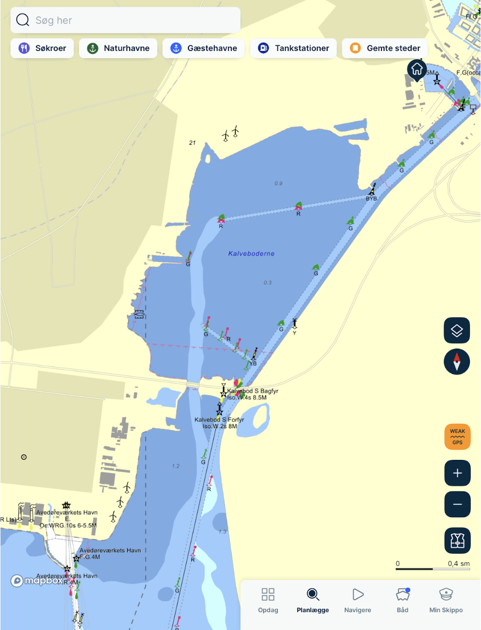 GARMIN Navionics og SKIPPO (Tidl. "Krak til Søs"), elektroniske søkort over Kalveboderne.